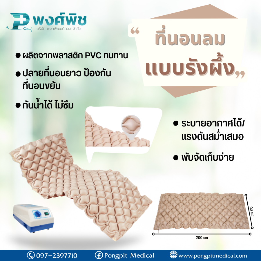 ที่นอนลม เป็นอุปกรณ์ ลักษณะพิเศษ ที่สามารถช่วยป้องกันแผลกดทับ ลดแรงกดและกระจายแรงกดทับ ได้อย่างดีเยี่ยม เพราะมันสามารถกระจายแรงกดทับ และลดการเสียดสีระหว่างผิวหนังของผู้ป่วยที่สัมผัสกับที่นอน โดยใช้แรงปั๊มลมจากเครื่องปั๊มไฟฟ้า ปั๊มทำงานแบบสลับการยุบ-พอง ของที่นอนลมต่อเนื่องตลอดเวลา ทำให้มีการเคลื่อนไหวอย่างต่อเนื่องโดยอัตโนมัติ เป็นจังหวะ ความนุ่ม และการพอง-ยุบ ของที่นอนลมช่วยทำให้เกิดความผ่อนคลาย และลดแรงกดทับได้เป็นอย่างดี ทำให้ร่างกายไม่ถูกกดทับ บริเวณใดบริเวณหนึ่งนานๆ จึงช่วยลดโอกาสการเกิด หรือช่วยลดความรุนแรงของแผลกดทับได้ จึงทำให้กล้ามเนื้อบริเวณดังกล่าวไม่เกิดการถูกกดทับด้วยน้าหนักของร่างกายและตามบริเวณเนื้อเยื่อที่เป็นปุ่มกระดูก