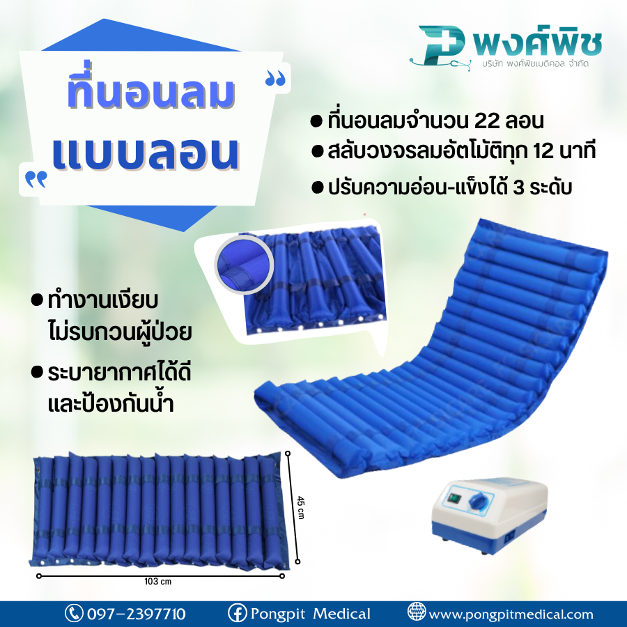 เหมาะสำหรับผู้ป่วยอัมพาต อัมพฤกษ์ ผู้สูงอายุ จะทำงานช่วยลดแรงกดทับ และกระจายแรงกดทับไปทั่วร่างกาย ลดแรงเสียดสีระหว่างที่นอนและผิวของผู้ป่วยด้วยระบบสลับการพองของลอนที่นอน ที่นอนแบบลอนขวาง มีการทำงานใช้หลักการเดียวกันกับบับเบิ้ล มีเพียงรูปแบบของวัสดุที่ใช้ทำ เป็นพีวีซีเคลือบทับกับเนื้อผ้าในกรณีที่นอนของเราใช้เนื้อผ้าที่นิ่มนวลและมี ค่าความ ทอที่สูงเนื้อผ้าจะละเอียด สามารถรับน้ำหนักผู้ป่วยได้ทุกขนาด สามารถถอดเปลี่ยนลูกลอนได้เป็นลูกๆเหมาะสำหรับ คนป่วยที่ยังรู้สึกตัว เพราะที่นอนลมแบบขวาง ออกแบบมาให้เหมาะสมกับขนาดรูปร่างและน้ำหนัก ของผู้ป่วยในประเทศไทย ทำให้ผู้ป่วยรู้สึกนอนแล้วสบายเหมือนนอนเตียงธรรมดา ไม่ได้ยึดขนาดรูปร่าง ในกรณีของการ รักษาถ้าเกิดผิดพลาดเข็มฉีดยาไป ทิ่มโดนตัวลอนจะยังสามารถใช้งานได้อีกระยะหนึ่งและสามารถถอดเปลี่ยนได้ที่ละลอน มีความสวยงามและเพิ่มเติมออปชั่น ได้หลายแบบและต้องการความสบายที่มากกว่าให้ กับคนป่วย