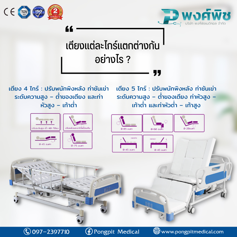 เตียง 5 ไกร์ : ปรับพนักพิงหลัง ท่าชันเข่า ระดับความสูง – ต่ำของเตียง ท่าหัวสูง – เท้าต่ำ และท่าหัวต่ำ – เท้าสูง