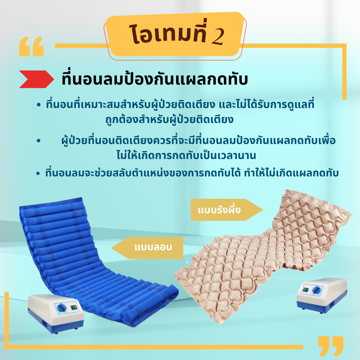 ที่นอนที่เหมาะสมสำหรับผู้ป่วยติดเตียง และไม่ได้รับการดูแลที่ถูกต้องสำหรับผู้ป่วยติดเตียง ไม่ว่าจะเป็นการพลิกตัว นวดตัว หรือการทำกายภาพ กายบริหารสำหรับผู้ป่วยติดเตียงอย่างง่ายๆ หรือแม้แต่เรื่องการรักษาความสะอาดให้กับผู้ป่วย และอาหารการกินของผู้ป่วย ก็อาจทำให้เกิดแผลกดทับในผู้ป่วยติดเตียงได้ ผู้ป่วยที่นอนติดเตียงควรที่จะมีที่นอนลมป้องกันแผลกดทับเพื่อไม่ให้เกิดการกดทับเป็นเวลานาน เพราะที่นอนลมจะช่วยสลับตำแหน่งของการกดทับได้ ทำให้ไม่เกิดแผลกดทับ