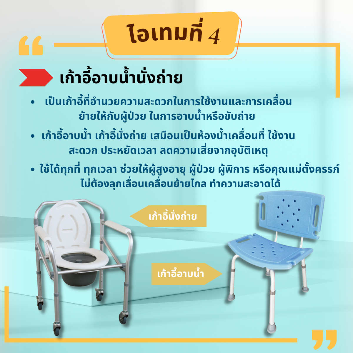 เก้าอี้อาบน้ำ เก้าอี้นั่งถ่าย เก้าอี้ผู้ป่วยพับได้ราคาถูก น้ำหนักเบา ถอดพับ จัดเก็บได้ ง่ายเสมือนเป็นห้องน้ำเคลื่อนที่ ประหยัดเวลาอีกขั้น รองรับน้ำหนักได้สูงถึง 100 กิโลกรัม ใช้ได้ทุกที่ ทุกเวลา ช่วยให้ผู้สูงอายุ ผู้ป่วย ผู้พิการ หรือคุณแม่ตั้งครรภ์ ไม่ต้องลุกเลื่อนเคลื่อนย้ายไกล ลดความเสี่ยจากอุบัติเหตุ พร้อมถอดชำระล้าง ทำความสะอาดได้ สะดวกสบายเป็นอย่างยิ่งในชีวิตประจำวัน