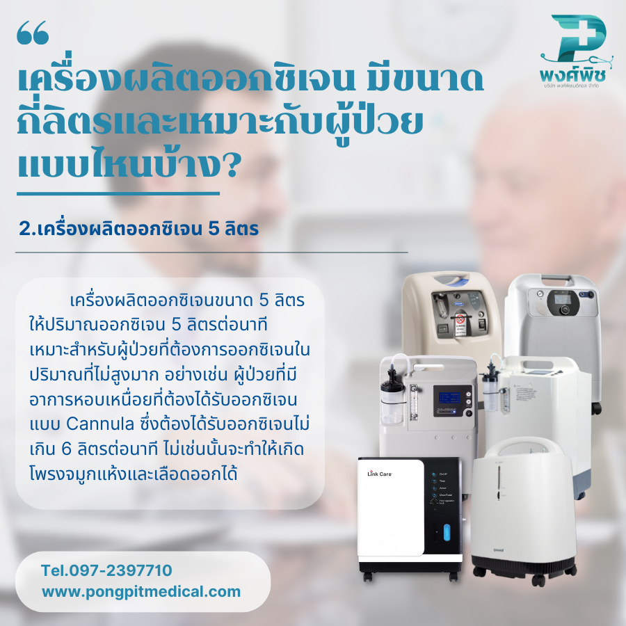 เครื่องผลิตออกซิเจนขนาด 5 ลิตร ให้ปริมาณออกซิเจน 5 ลิตรต่อนาที เหมาะสำหรับผู้ป่วยที่ต้องการออกซิเจนในปริมาณที่ไม่สูงมาก อย่างเช่น ผู้ป่วยที่มีอาการหอบเหนื่อยที่ต้องได้รับออกซิเจนแบบ Cannula ซึ่งต้องได้รับออกซิเจนไม่เกิน 6 ลิตรต่อนาที ไม่เช่นนั้นจะทำให้เกิดโพรงจมูกแห้งและเลือดออกได้