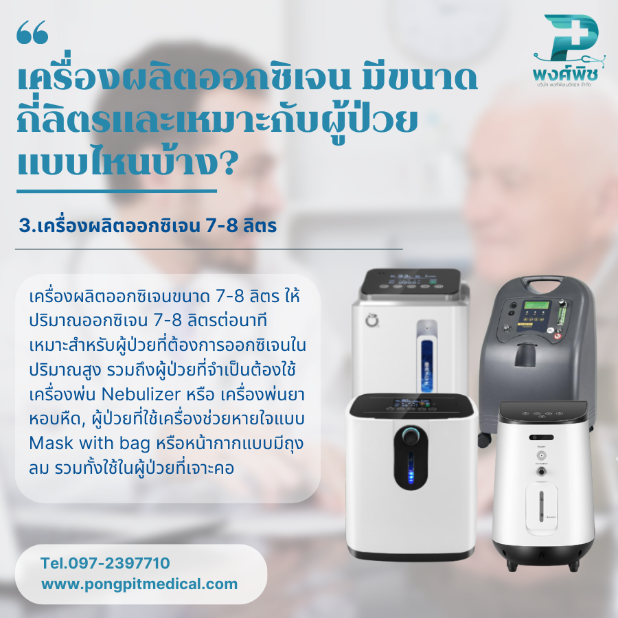 เครื่องผลิตออกซิเจนขนาด 7-8 ลิตร ให้ปริมาณออกซิเจน 7-8 ลิตรต่อนาที เหมาะสำหรับผู้ป่วยที่ต้องการออกซิเจนในปริมาณสูง รวมถึงผู้ป่วยที่จำเป็นต้องใช้เครื่องพ่น Nebulizer หรือ เครื่องพ่นยาหอบหืด, ผู้ป่วยที่ใช้เครื่องช่วยหายใจแบบ Mask with bag หรือหน้ากากแบบมีถุงลม รวมทั้งใช้ในผู้ป่วยที่เจาะคอ