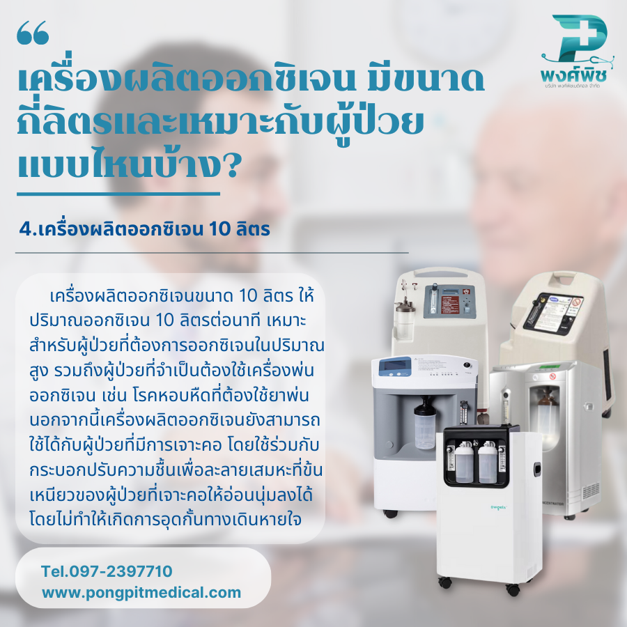เครื่องผลิตออกซิเจนขนาด 10 ลิตร ให้ปริมาณออกซิเจน 10 ลิตรต่อนาที เหมาะสำหรับผู้ป่วยที่ต้องการออกซิเจนในปริมาณสูง รวมถึงผู้ป่วยที่จำเป็นต้องใช้เครื่องพ่นออกซิเจน เช่น โรคหอบหืดที่ต้องใช้ยาพ่น นอกจากนี้เครื่องผลิตออกซิเจนยังสามารถใช้ได้กับผู้ป่วยที่มีการเจาะคอ โดยใช้ร่วมกับกระบอกปรับความชื้นเพื่อละลายเสมหะที่ข้นเหนียวของผู้ป่วยที่เจาะคอให้อ่อนนุ่มลงได้ โดยไม่ทำให้เกิดการอุดกั้นทางเดินหายใจ