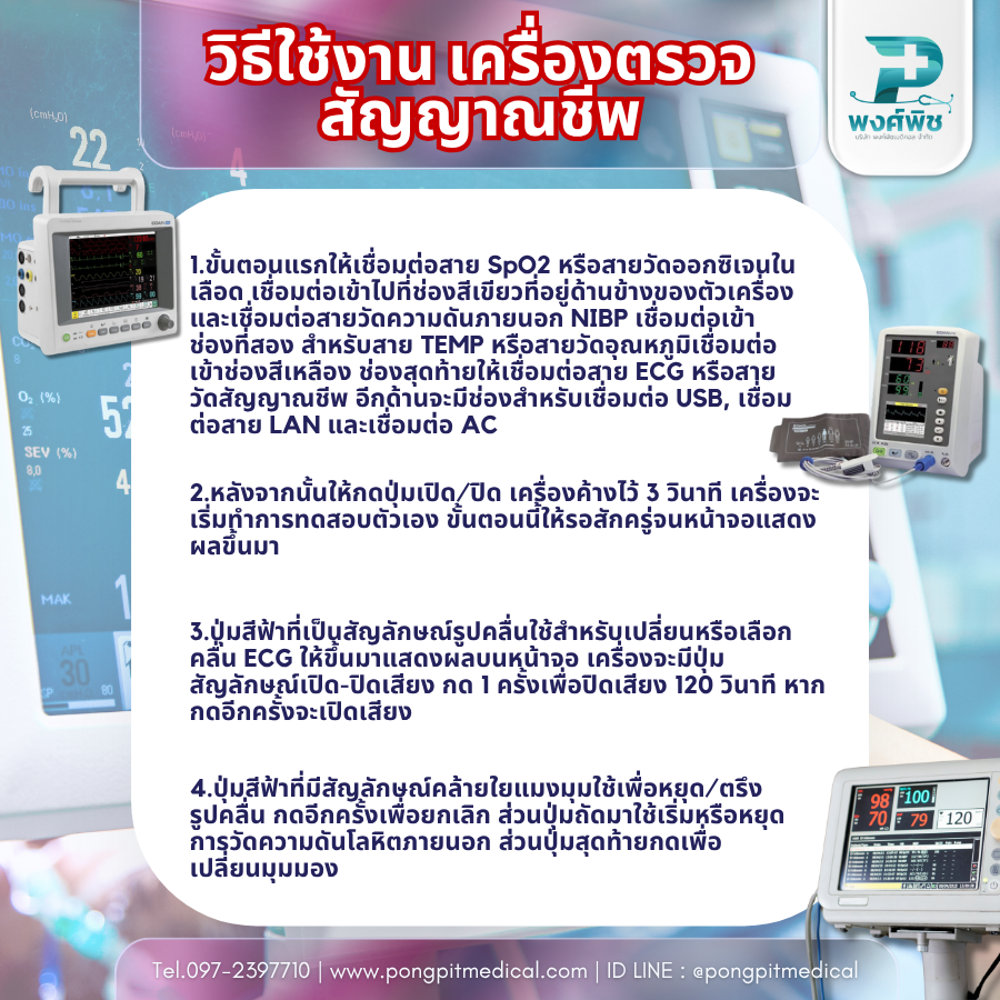 วิธีใช้งาน เครื่องตรวจสัญญาณชีพ- ขั้นตอนแรกให้เชื่อมต่อสาย SpO2 หรือสายวัดออกซิเจนในเลือด เชื่อมต่อเข้าไปที่ช่องสีเขียวที่อยู่ด้านข้างของตัวเครื่อง และเชื่อมต่อสายวัดความดันภายนอก NIBP เชื่อมต่อเข้าช่องที่สอง สำหรับสาย TEMP หรือสายวัดอุณหภูมิเชื่อมต่อเข้าช่องสีเหลือง ช่องสุดท้ายให้เชื่อมต่อสาย ECG หรือสายวัดสัญญาณชีพ อีกด้านจะมีช่องสำหรับเชื่อมต่อ USB, เชื่อมต่อสาย LAN และเชื่อมต่อ AC