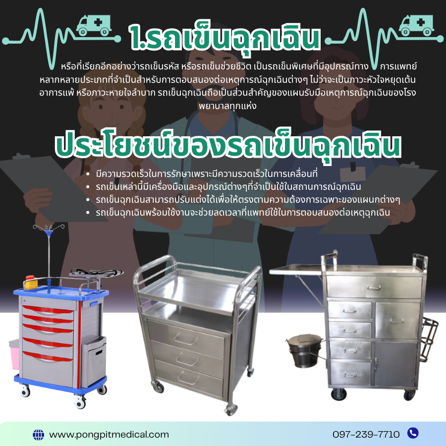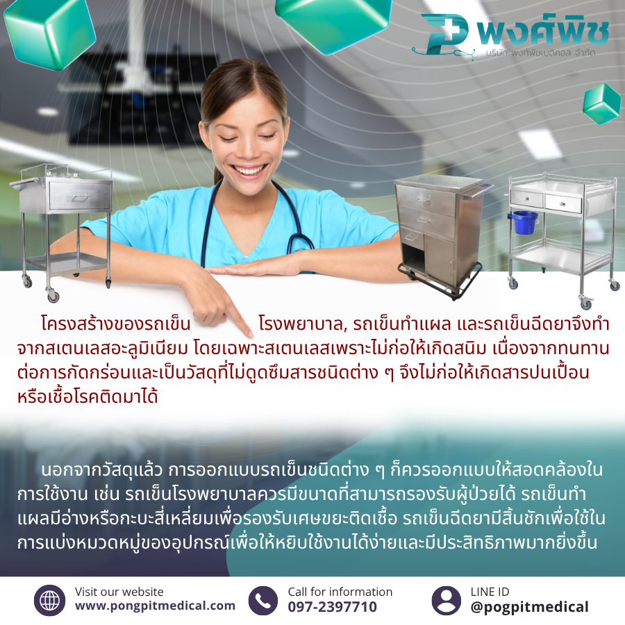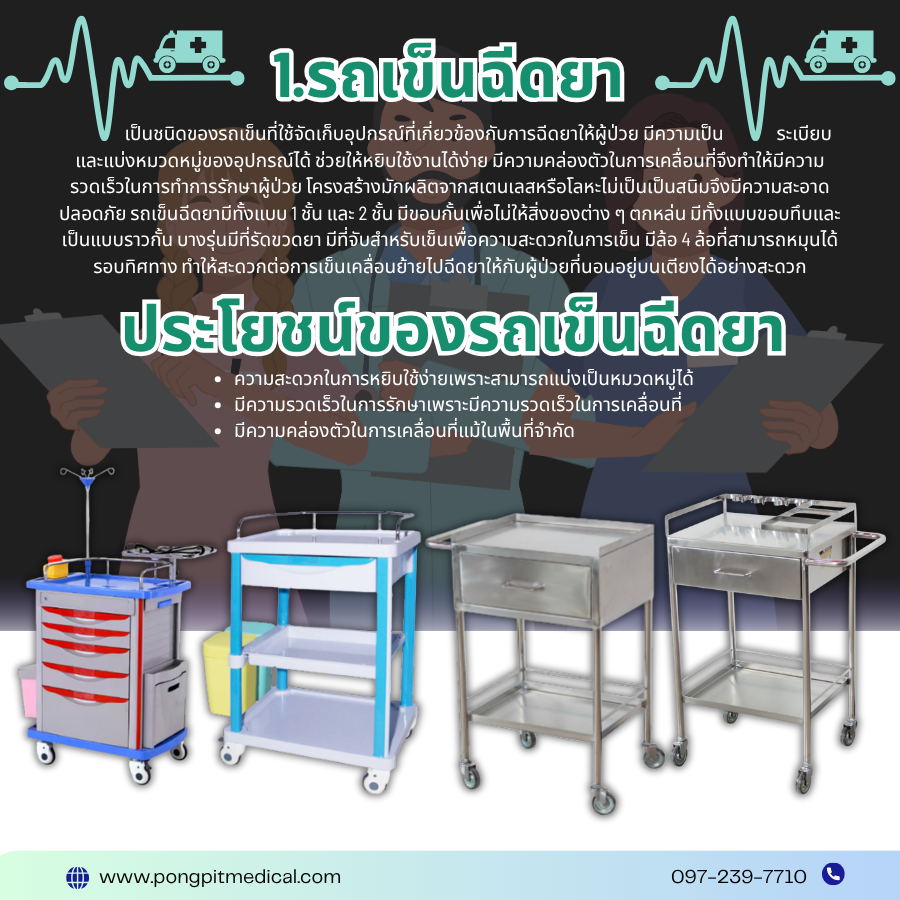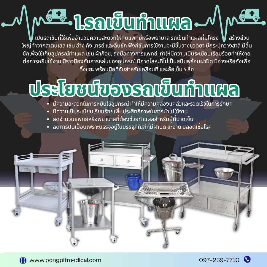 1.รถเข็นทำแผล เป็นรถเข็นที่ใช้เพื่ออำนวยความสะดวกให้กับแพทย์หรือพยาบาล รถเข็นทำแผลที่มีโครงสร้างส่วนใหญ่ทำจากสเตนเลส เช่น อ่าง ถัง เทรย์ และลิ้นชัก ฟังก์ชั่นการใช้งานจะมีชั้นวางขวดยา มีกระปุกวางสำลี มีลิ้นชักเพื่อใช้เก็บอุปกรณ์ทำแผล เช่น ผ้าก๊อซ, ถุงมือทางการแพทย์, ทำให้มีความเป็นระเบียบเรียบร้อยทำให้ง่ายต่อการหยิบใช้งาน มีราวป้องกันการหล่นของอุปกรณ์ มีถาดโลหะที่ไม่เป็นสนิมพร้อมฝาปิด มีอ่างหรือถังเพื่อทิ้งขยะ พร้อมมือที่จับสำหรับเคลื่อนที่ และล้อเข็น 4 ล้อ