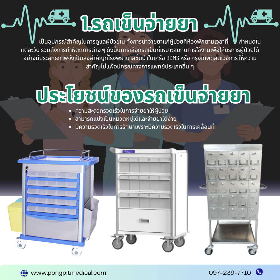 3.รถเข็นจ่ายยา เป็นอุปกรณ์สำคัญในการดูแลผู้ป่วยใน ทั้งการนำจ่ายยาแก่ผู้ป่วยที่ห้องพักตามเวลาที่กำหนดในแต่ละวัน รวมถึงการทำหัตถการต่าง ๆ ดังนั้นการเลือกรถเข็นที่เหมาะสมกับการใช้งานเพื่อให้บริการผู้ป่วยได้อย่างมีประสิทธิภาพจึงเป็นสิ่งสำคัญที่โรงพยาบาลชั้นนำในเครือ BDMS หรือ กรุงเทพดุสิตเวชการ ให้ความสำคัญไม่แพ้อุปกรณ์ทางการแพทย์ประเภทอื่น ๆ