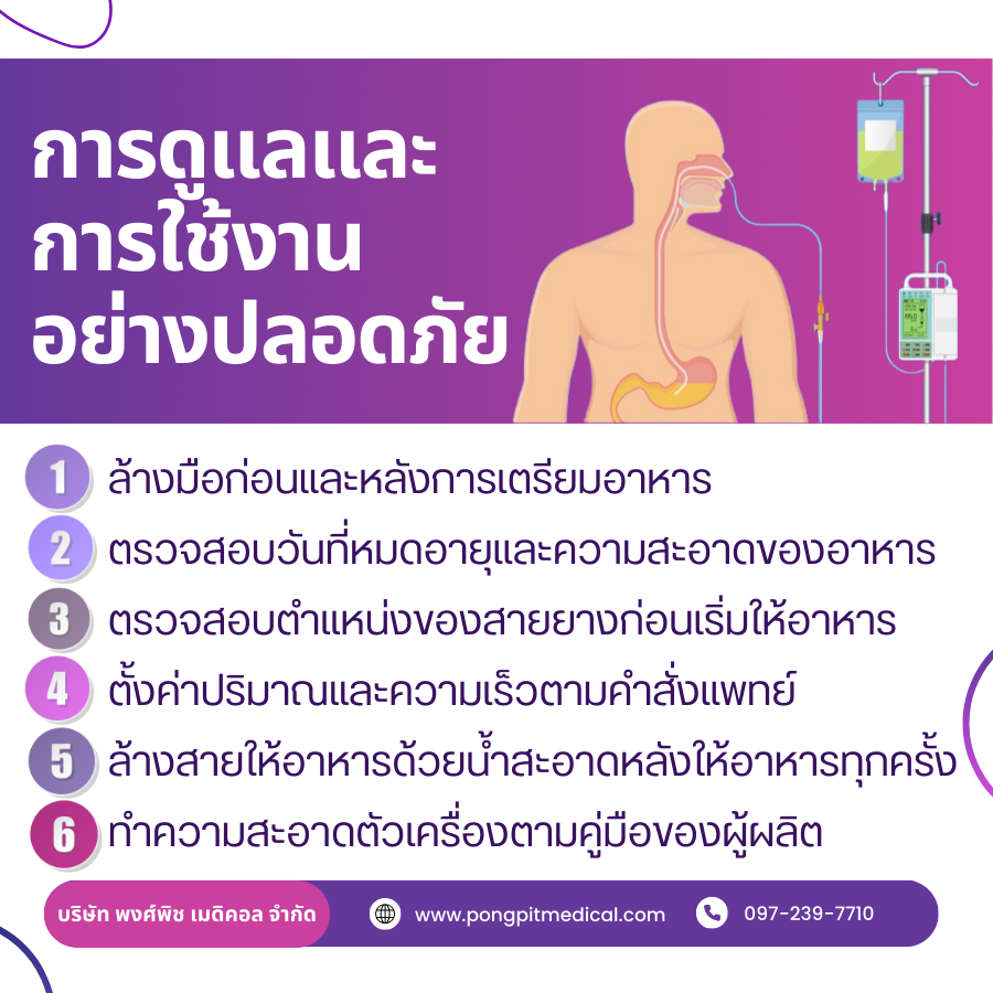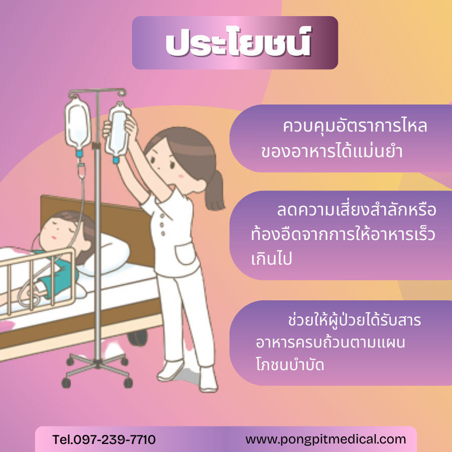 • ชุดสายให้อาหาร: ต่อจากถุงอาหารเข้าสู่สายยางผู้ป่วย