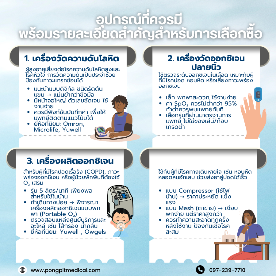 การดูแลผู้สูงอายุให้ปลอดภัยและมีคุณภาพชีวิตที่ดี จำเป็นต้องมีอุปกรณ์การแพทย์พื้นฐานไว้ในบ้าน เพื่อช่วยเฝ้าระวัง ป้องกัน และบรรเทาอาการเจ็บป่วยได้อย่างทันท่วงที ด้านล่างคืออุปกรณ์ที่ควรมี พร้อมรายละเอียดสำคัญสำหรับการเลือกซื้อ