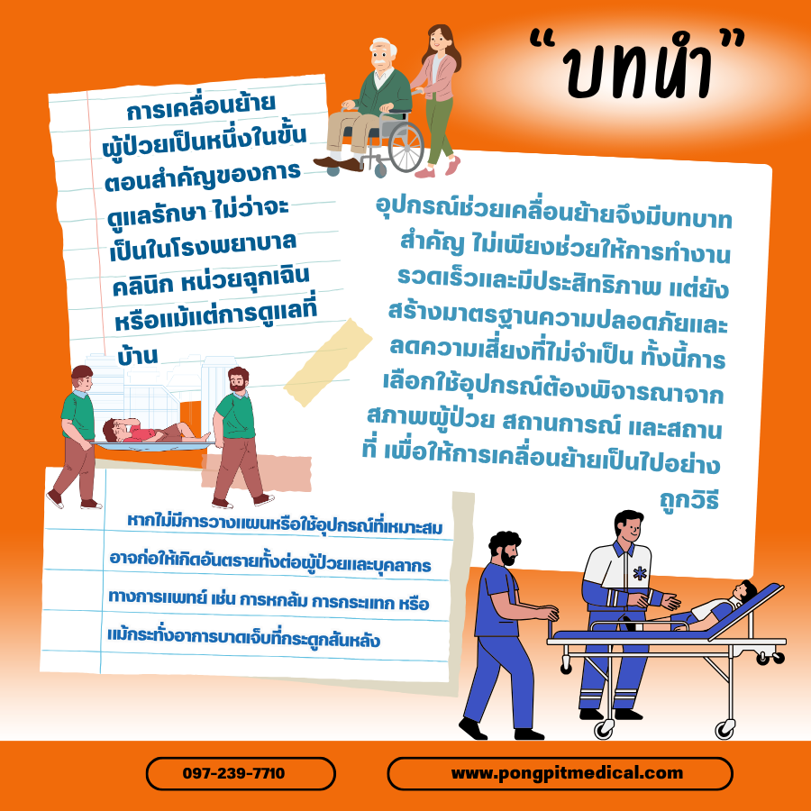 การเคลื่อนย้ายผู้ป่วยไม่ใช่เพียงแค่การ “พาไปอีกที่หนึ่ง” แต่เป็นกระบวนการที่เกี่ยวข้องกับ ความปลอดภัย, ประสิทธิภาพ และมาตรฐานการดูแล การเลือกใช้อุปกรณ์ที่เหมาะสม ไม่ว่าจะเป็นรถเข็น เปล เก้าอี้เคลื่อนย้าย หรืออุปกรณ์ยกผู้ป่วย ล้วนช่วยลดความเสี่ยงทั้งผู้ป่วยและบุคลากร