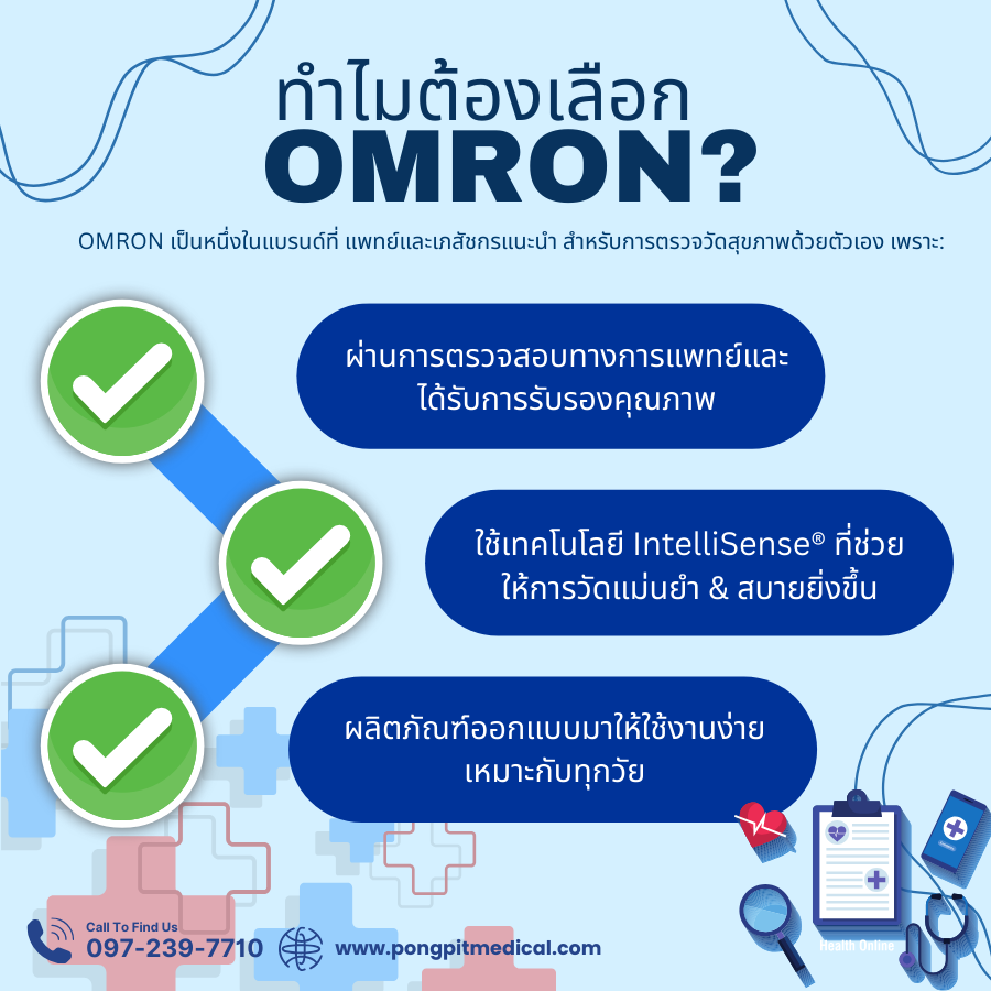 Omron Healthcare คือแบรนด์อุปกรณ์การแพทย์ชั้นนำจากประเทศญี่ปุ่น ที่ได้รับความไว้วางใจจากโรงพยาบาล คลินิก ร้านยา และผู้ใช้งานทั่วไปทั่วโลก จุดเด่นของ OMRON คือ ความแม่นยำ, มาตรฐานทางการแพทย์, และ ความหลากหลายของหมวดหมู่สินค้า ครอบคลุมการดูแลสุขภาพตั้งแต่การตรวจวัด ไปจนถึงการฟื้นฟูและป้องกันโรค