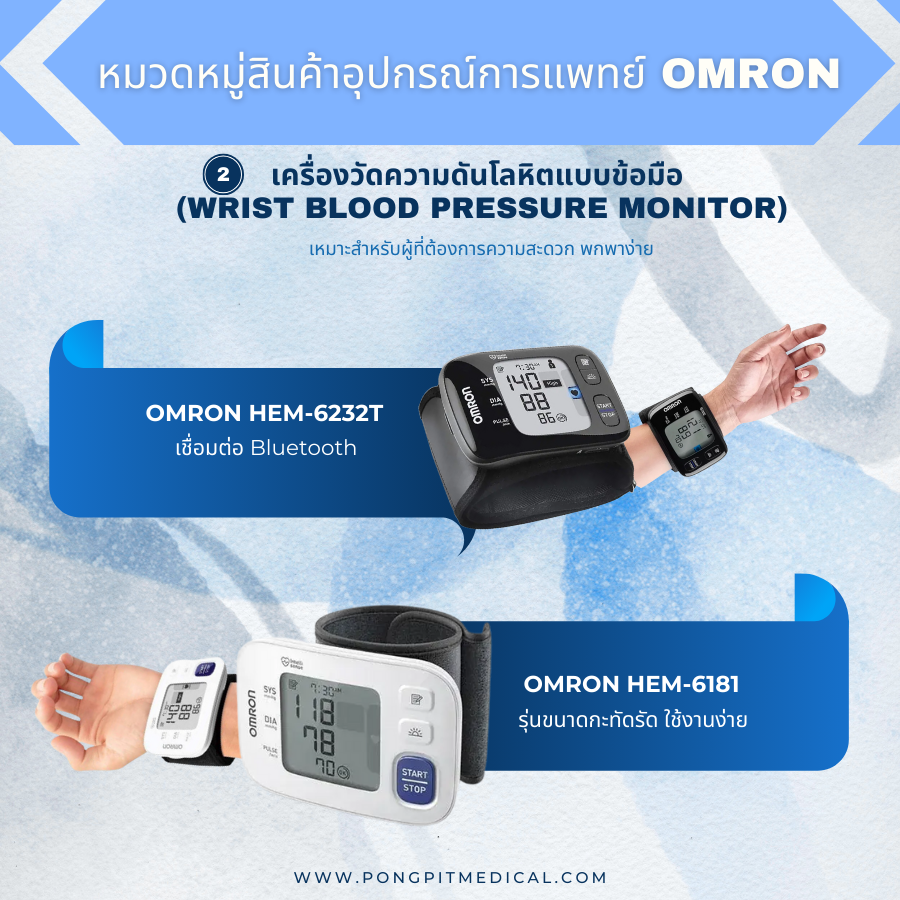 2. เครื่องวัดความดันโลหิตแบบข้อมือ (Wrist Blood Pressure Monitor)เหมาะสำหรับผู้ที่ต้องการความสะดวก พกพาง่ายตัวอย่างรุ่น- OMRON HEM-6232T – เชื่อมต่อ Bluetooth