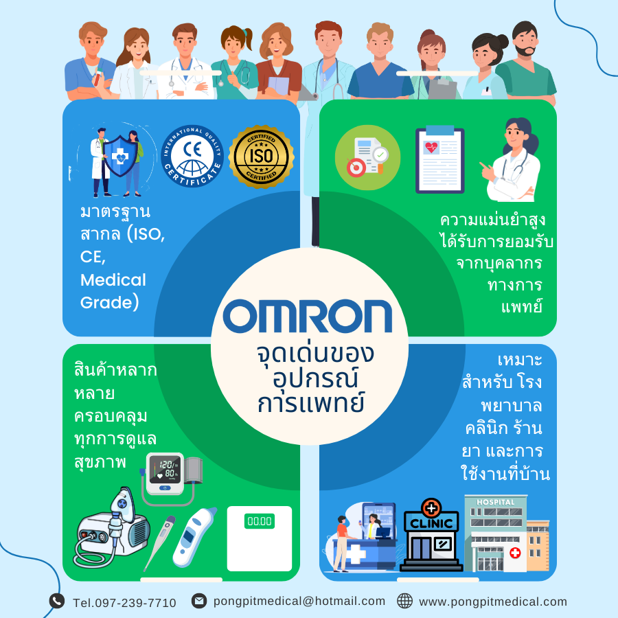 Omron Healthcare คือแบรนด์อุปกรณ์การแพทย์ชั้นนำจากประเทศญี่ปุ่น ที่ได้รับความไว้วางใจจากโรงพยาบาล คลินิก ร้านยา และผู้ใช้งานทั่วไปทั่วโลก จุดเด่นของ OMRON คือ ความแม่นยำ, มาตรฐานทางการแพทย์, และ ความหลากหลายของหมวดหมู่สินค้า ครอบคลุมการดูแลสุขภาพตั้งแต่การตรวจวัด ไปจนถึงการฟื้นฟูและป้องกันโรค