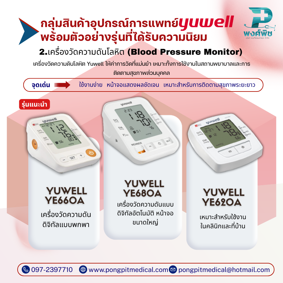 2. เครื่องวัดความดันโลหิต (Blood Pressure Monitor)เครื่องวัดความดันโลหิต Yuwell ให้ค่าการวัดที่แม่นยำ เหมาะทั้งการใช้งานในสถานพยาบาลและการติดตามสุขภาพส่วนบุคคลรุ่นแนะนำ- Yuwell YE660A – เครื่องวัดความดันดิจิทัลแบบพกพา