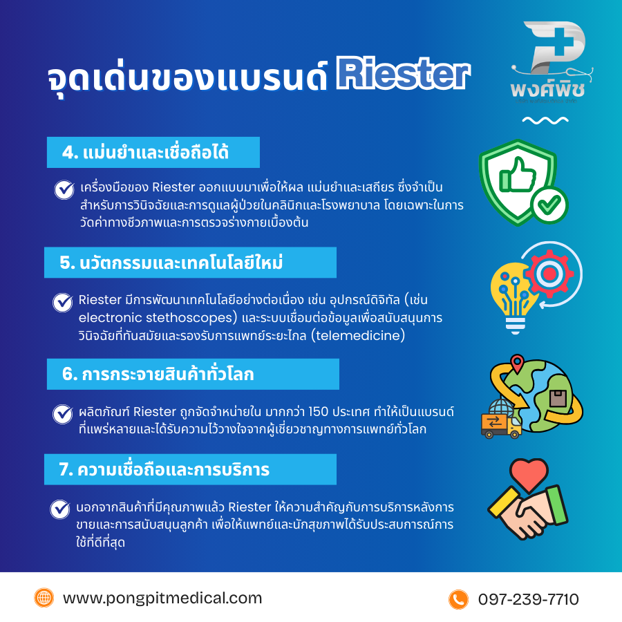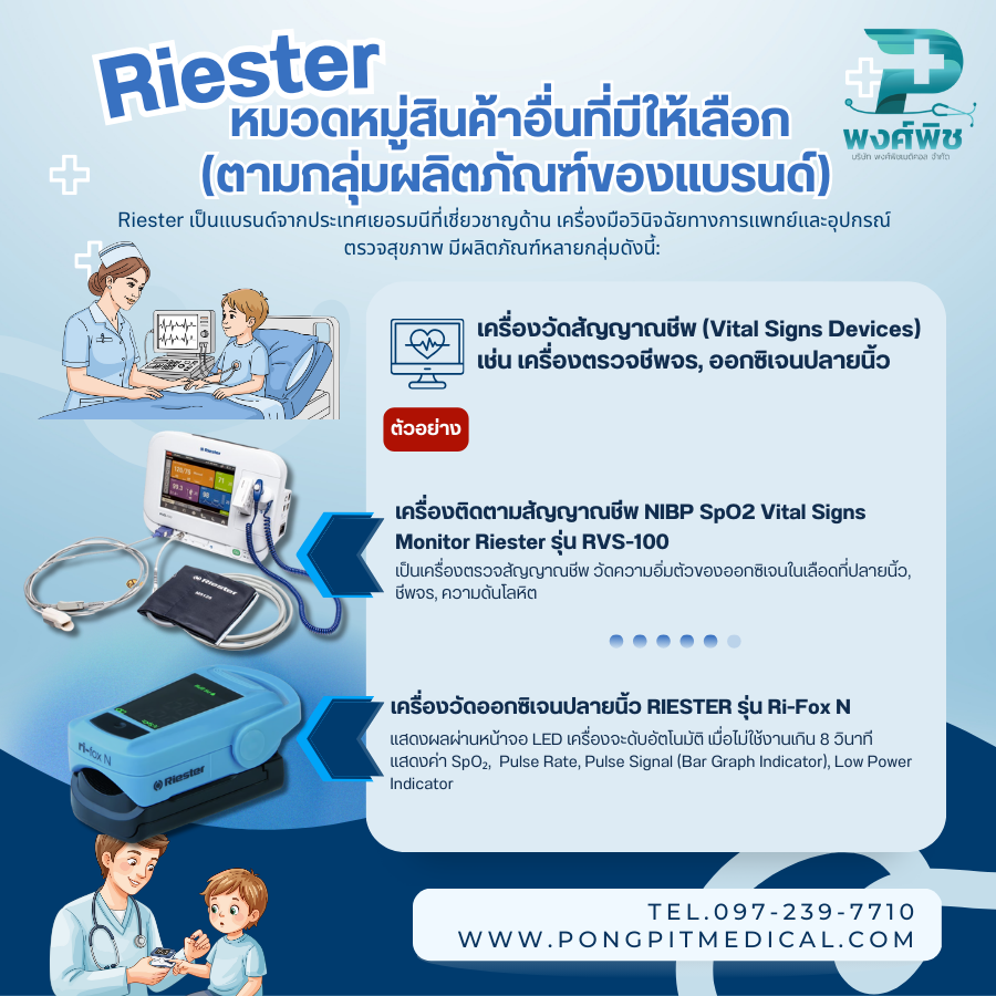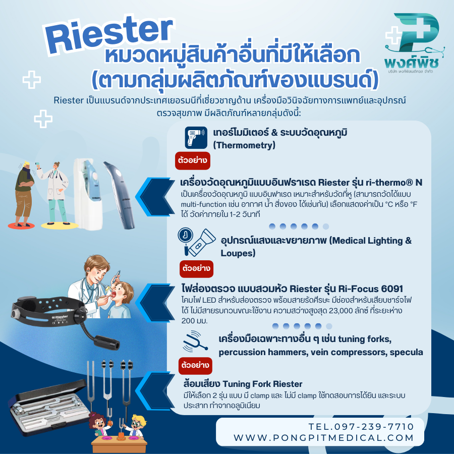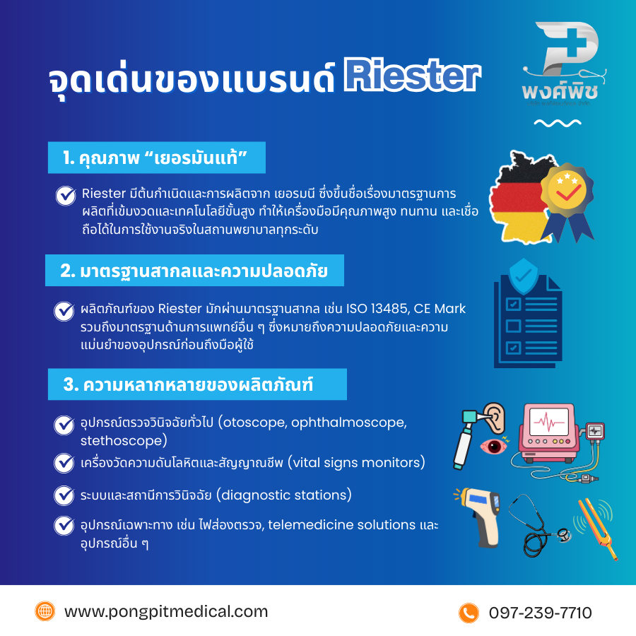 นี่คือ อุปกรณ์การแพทย์และเครื่องมือแพทย์แบรนด์ Riester ที่เป็นที่รู้จักและนิยมใช้งานในคลินิก โรงพยาบาล และสถานพยาบาลต่าง ๆ รวมทั้งตัวอย่างสินค้าที่คุณอาจพบซื้อออนไลน์ได้