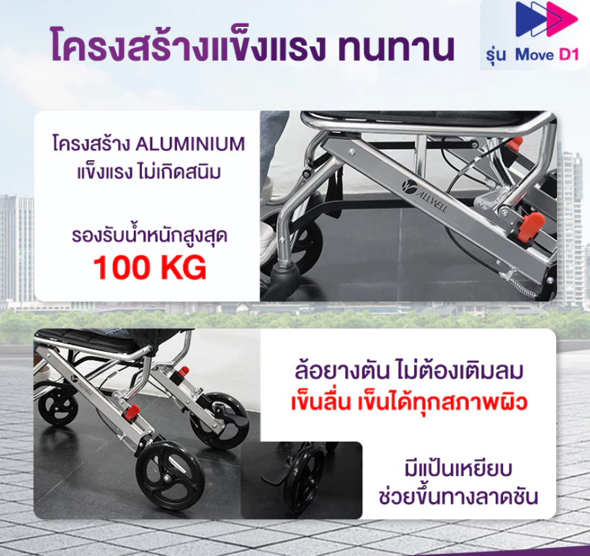 - รถเข็นสามารถรับน้ำหนักผู้ใช้ได้สูงสุด 100 kg