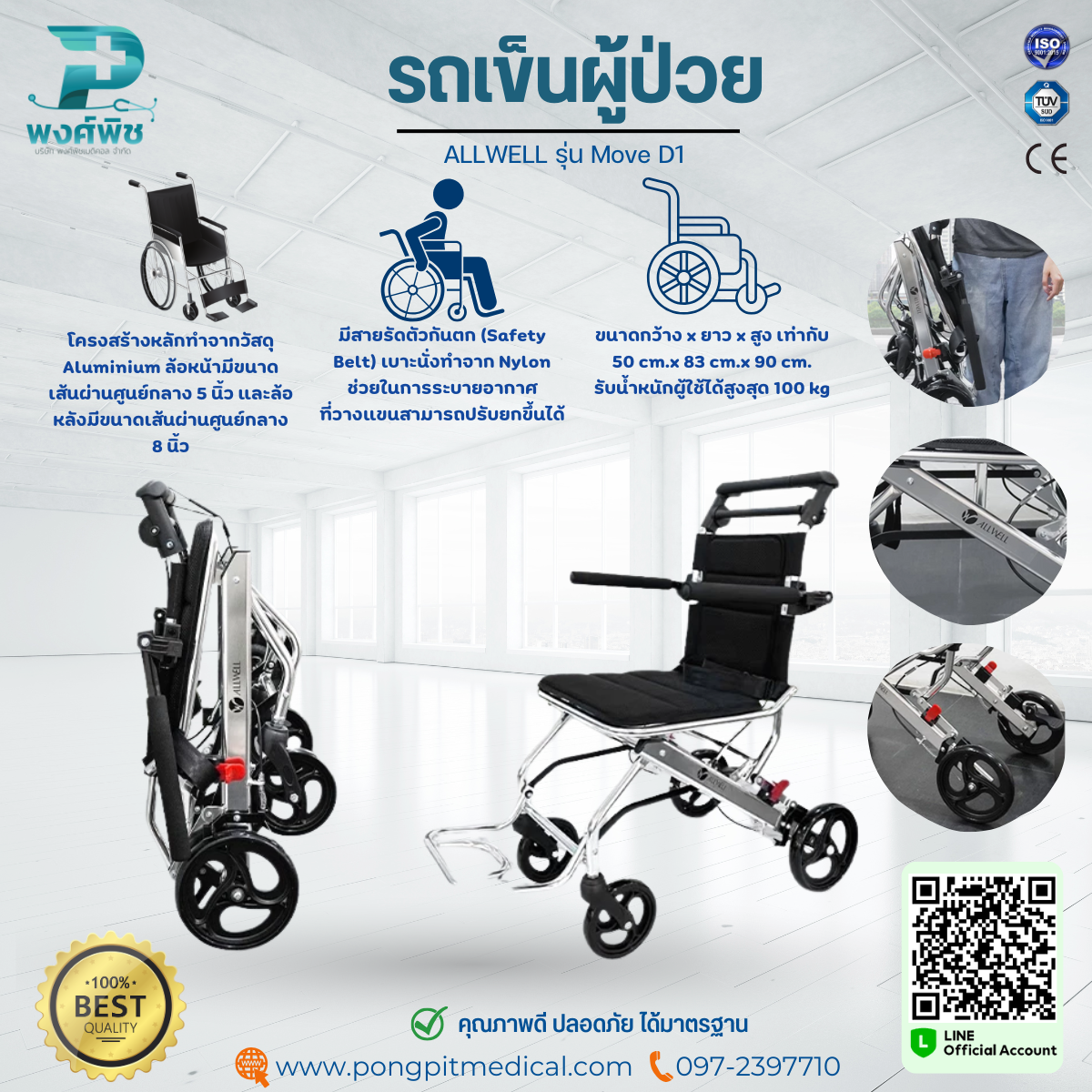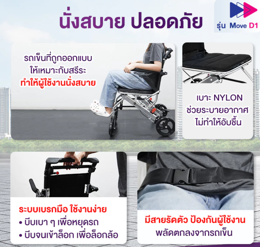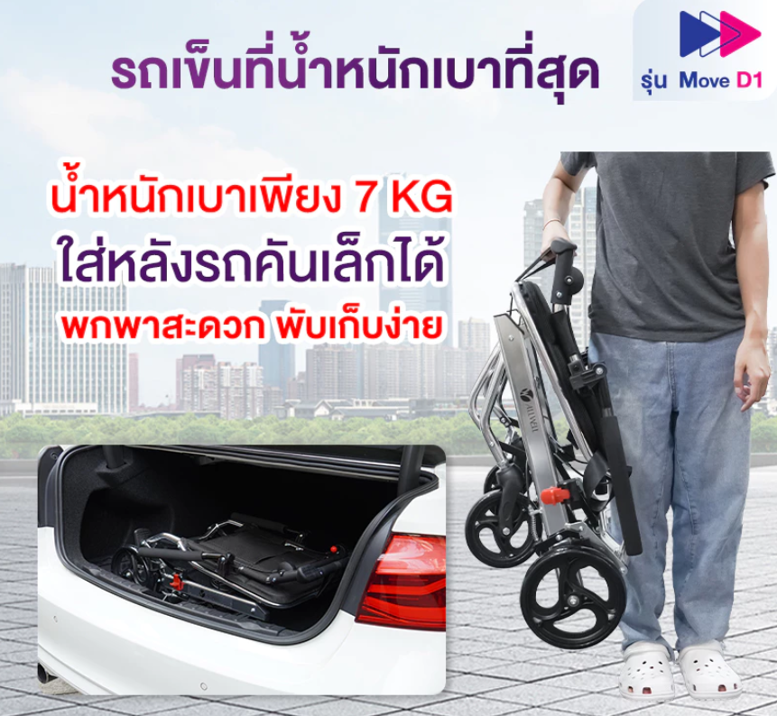 รถเข็นผู้ป่วย พับเก็บได้ และมีน้ำหนักเบาเพียง 7 kg สามารถนำใส่ท้ายรถ สะดวกในการเคลื่อนย้าย มีสายรัดตัวกันตก (Safety Belt)