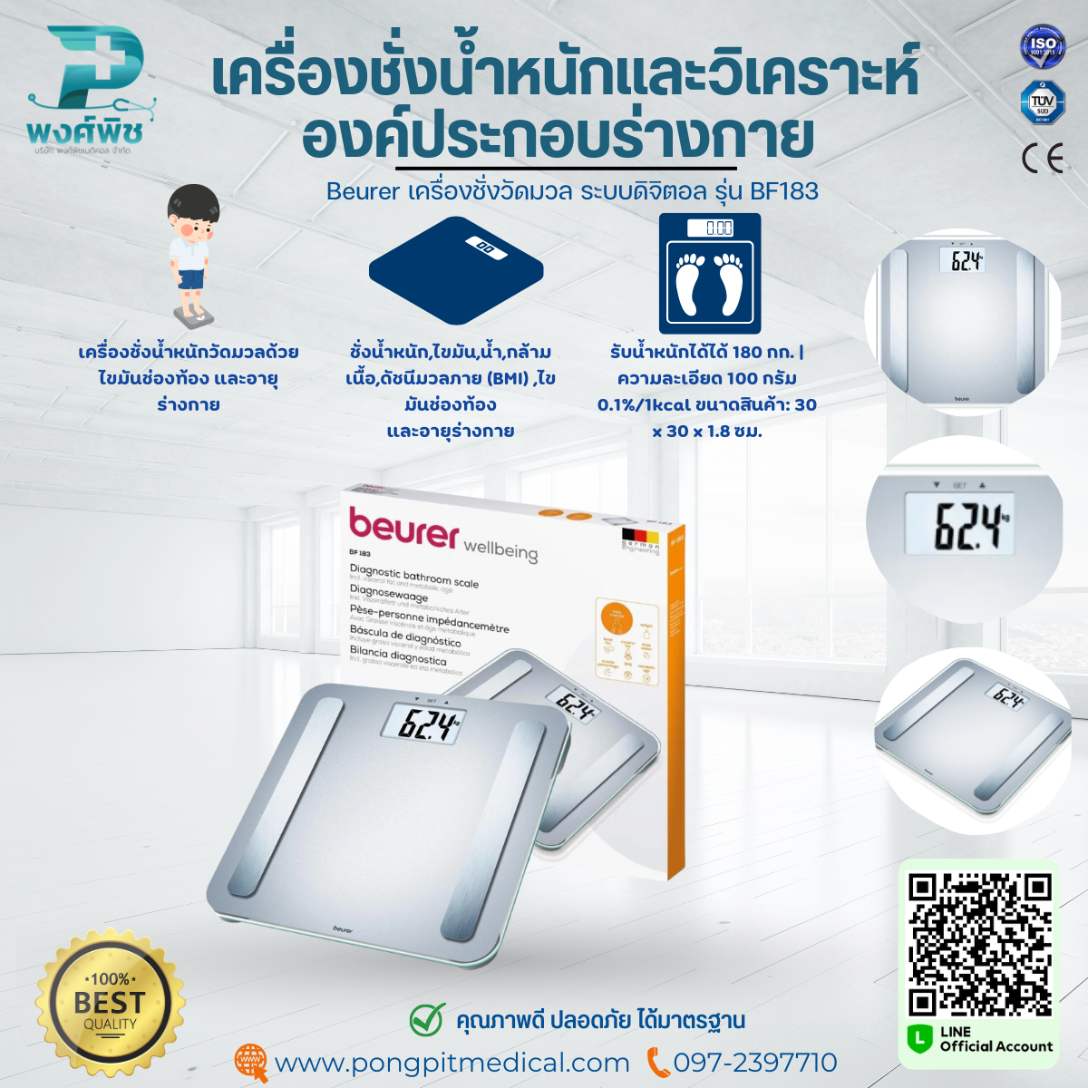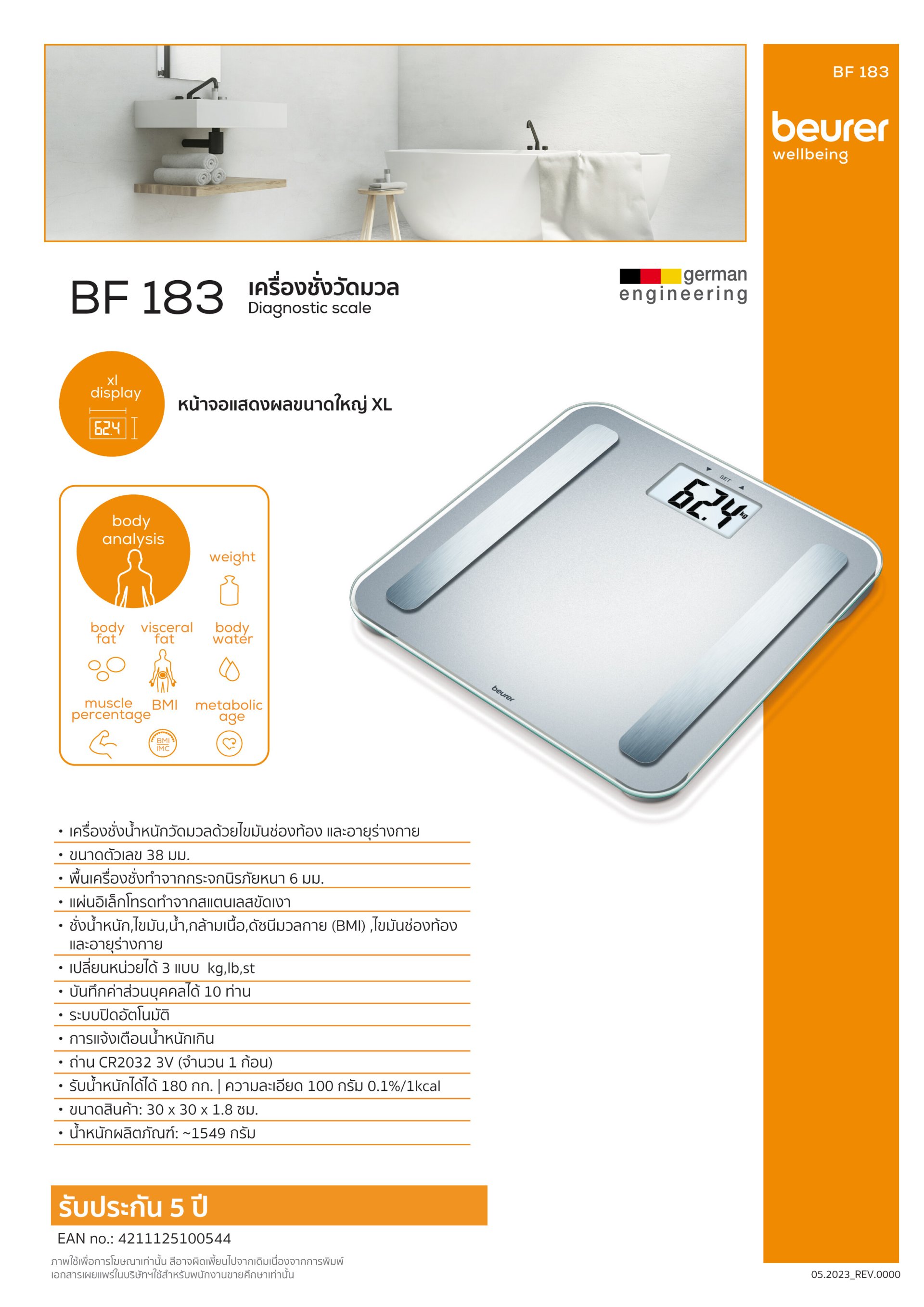 เครื่องชั่งน้ำหนัก ออกแบบมาพร้อมฟังก์ชันการวัดองค์ประกอบร่างกายที่แม่นยำ ทั้ง ไขมัน น้ำ กล้ามเนื้อ BMI ไขมันช่องท้อง และอายุร่างกาย