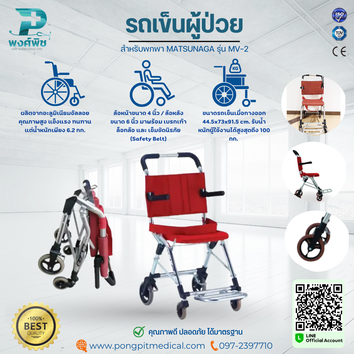 รถเข็นคุณภาพจากแบรนด์ MATSUNAGA ออกแบบมาเพื่อช่วยอำนวยความสะดวกในการเคลื่อนย้ายสำหรับผู้ที่มีปัญหาด้านการเคลื่อนไหว โครงสร้างแข็งแรง แต่น้ำหนักเบา ใช้งานง่าย พับเก็บได้ เหมาะทั้งใช้งานที่บ้าน โรงพยาบาล หรือพกพาเดินทาง